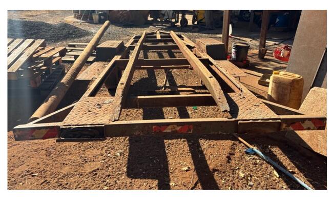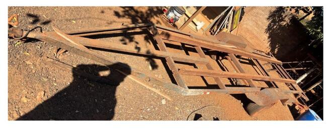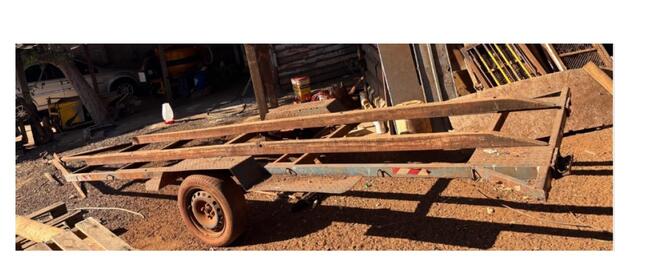 Foi constatado que a referida carretinha/reboque está em local fechado, porém, exposta ao tempo, possui foco de ferrugem devido a desgastes na pintura, sistema elétrico danificado com ausência de lanternas/lâmpadas, também ausente a placa de identificação.